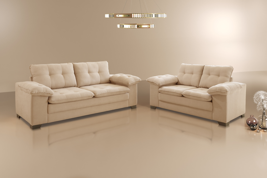 Assentos com percintas elásticas italianas transpassadas e entrelaçadas por uma percintadora automática, molas espirais, espumação hiper soft D28 e manta acrílica siliconada, totalizando 16 cm de altura.