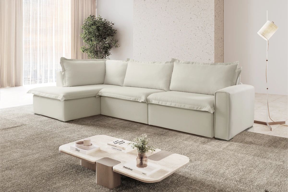 Assentos com mecanismos em tubos de aço e sistema retrátil em metal, percintas elásticas italianas transpassadas e entrelaçadas por percintadora automática, molas espirais, espumação hiper soft D28 e manta acrílica siliconada, totalizando 16 cm de altura.
